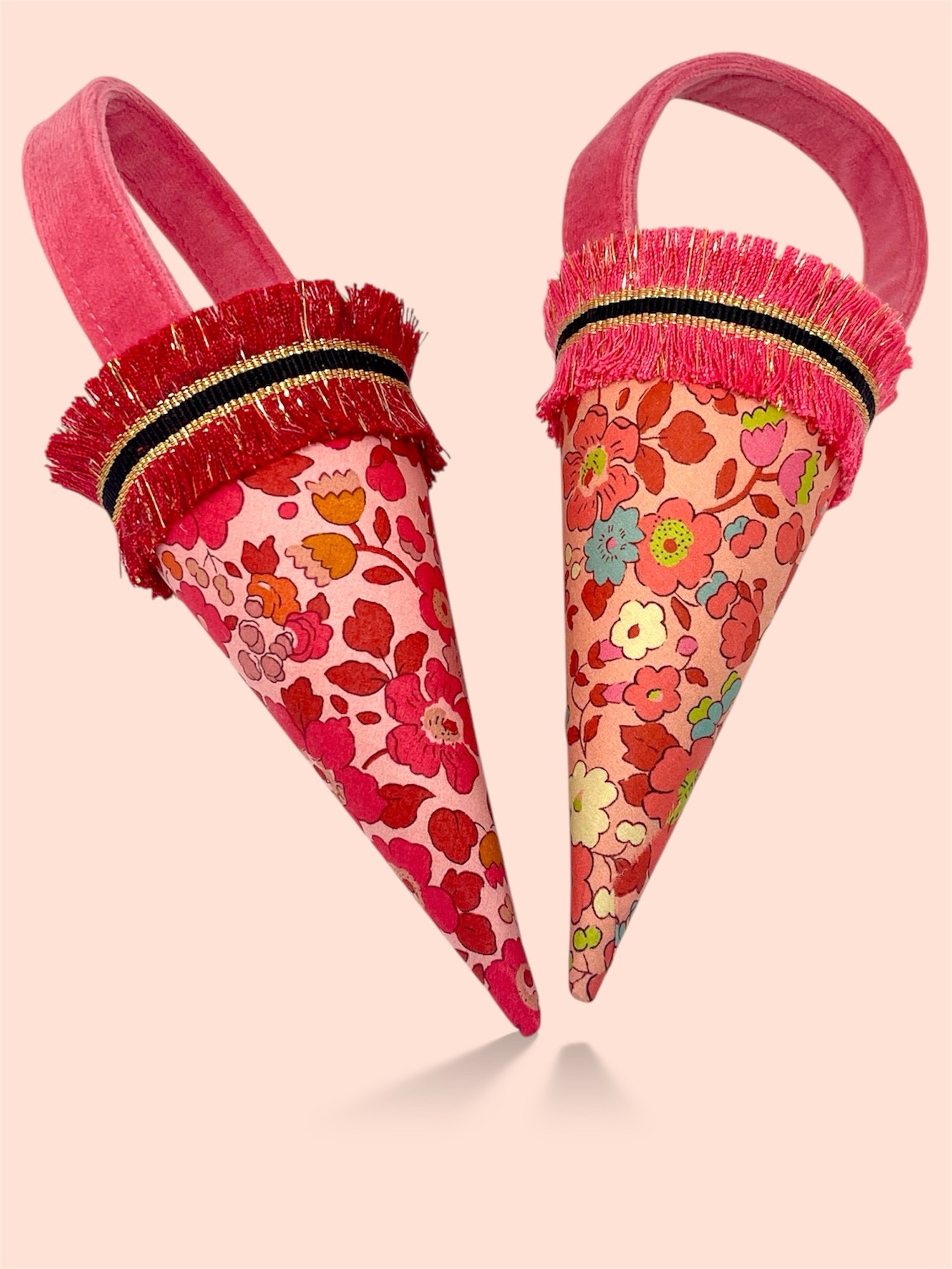 Kræmmerhuset består af en papkegle beklædt med Libertystof, kantet med Jaquard bånd og foret med uldfilt. Hanken er i velour. Selve keglen er 14 cm høj.