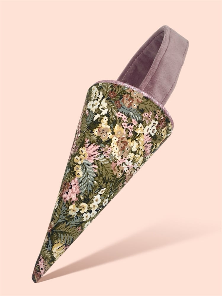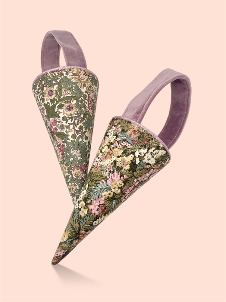 Kræmmerhuset består af en papkegle beklædt med Libertystof, kantet med pipingbånd og foret med uldfilt. Hanken er syet i rosa velour. Selve keglen er 14 cm høj.