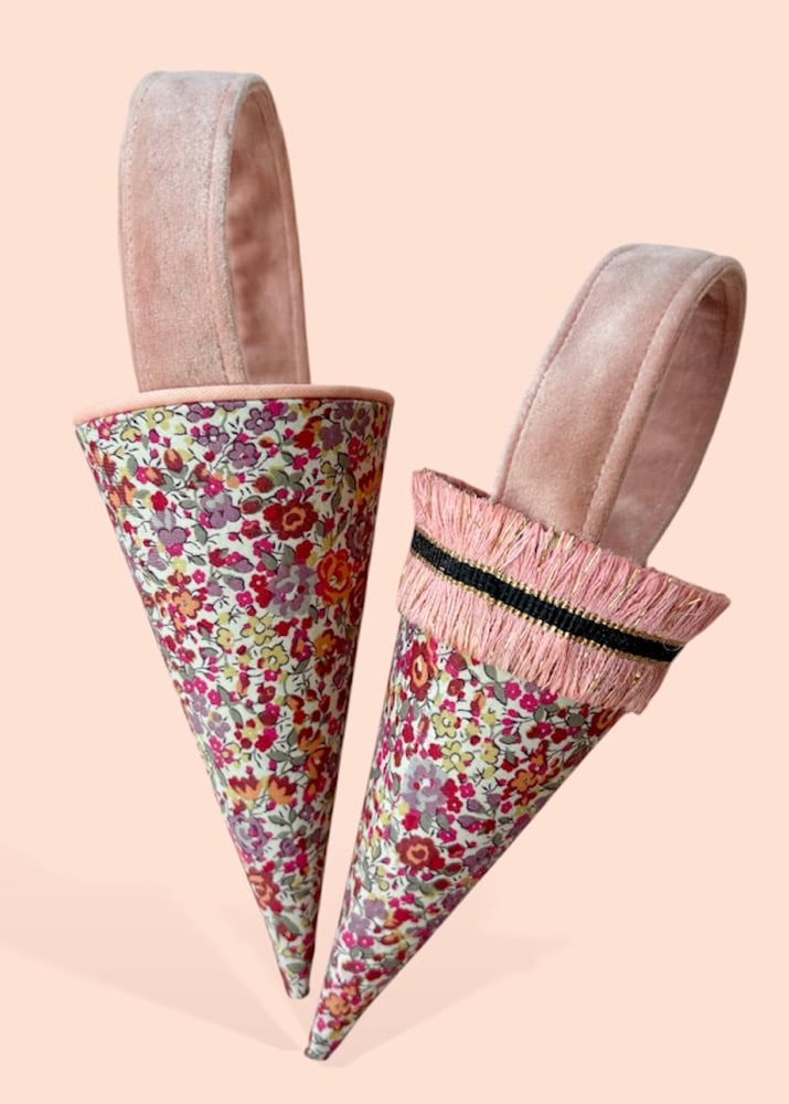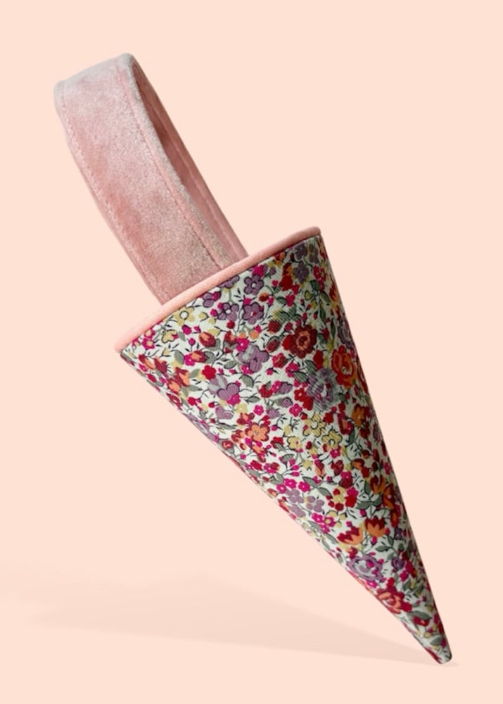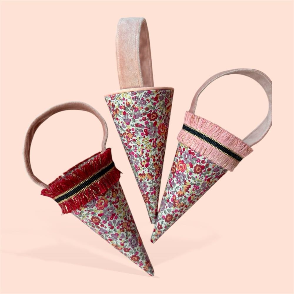 Kræmmerhuset består af en papkegle beklædt med Libertystof, kantet med Liberty pipingbånd og foret med uldfilt. Hanken er syet i rosa velour. Selve keglen er 14 cm høj.