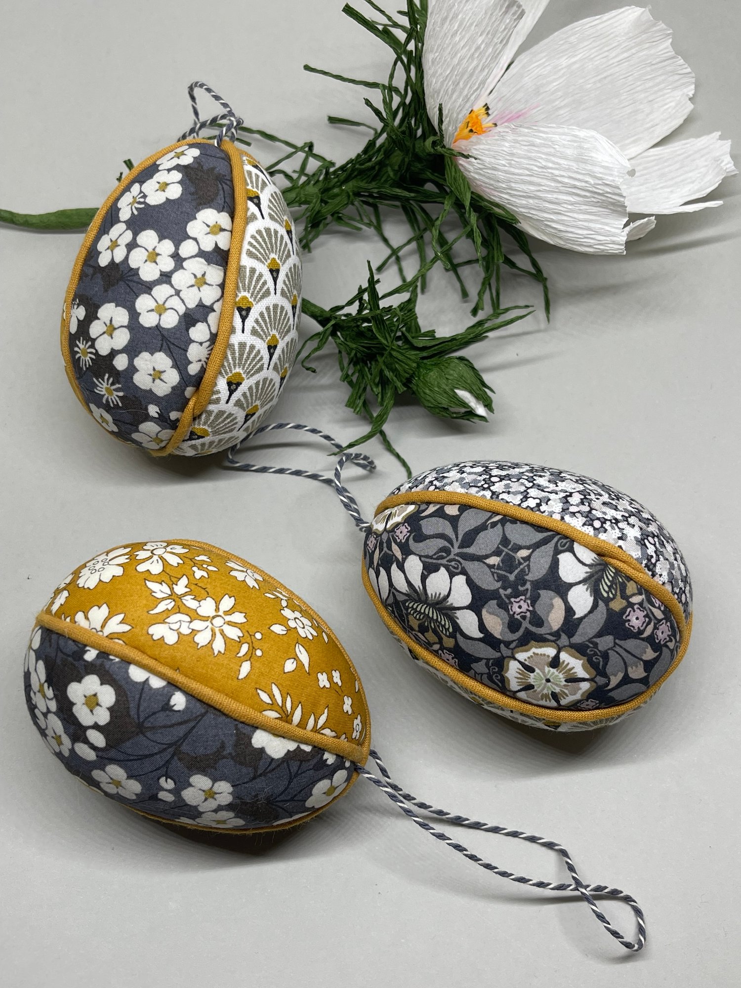 Håndlavede unikke påskeæg. Styroporæg er beklædt med Liberty stof og kantet med pipingbånd i grå og okker nuancer. Disse æg måler 8 cm og har snor til ophæng.