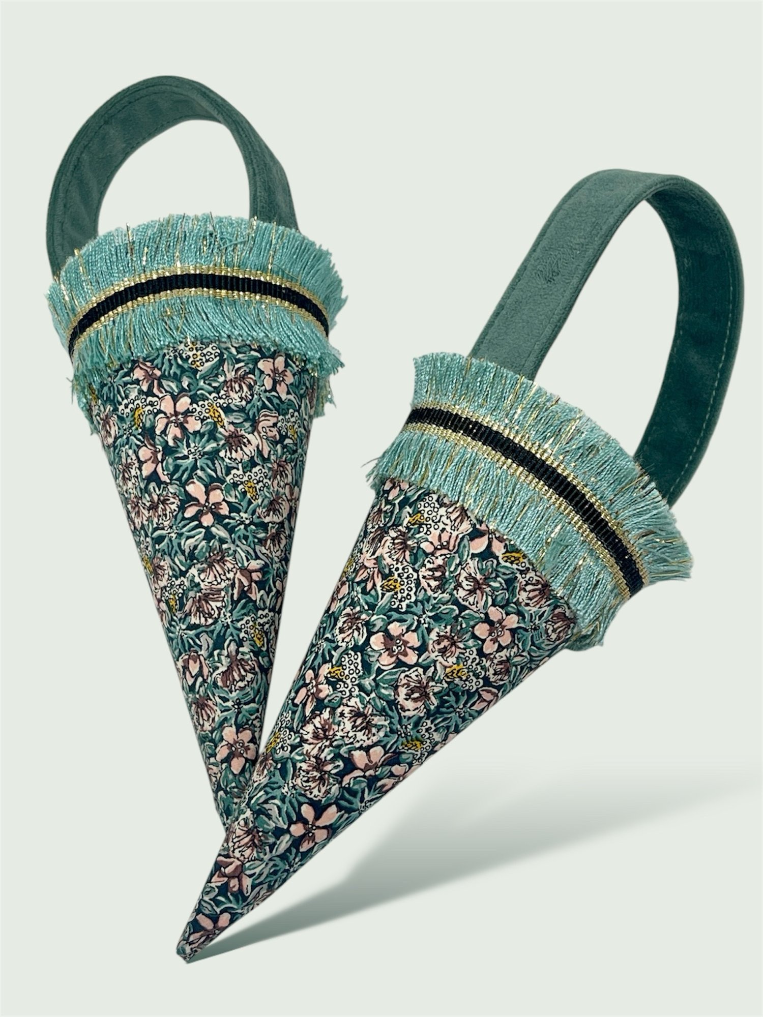 Kræmmerhuset består af en papkegle beklædt med Libertystof, kantet med Jaquard frynsebånd og foret med uldfilt. Hanken er syet i velour. Selve keglen er 14 cm høj.