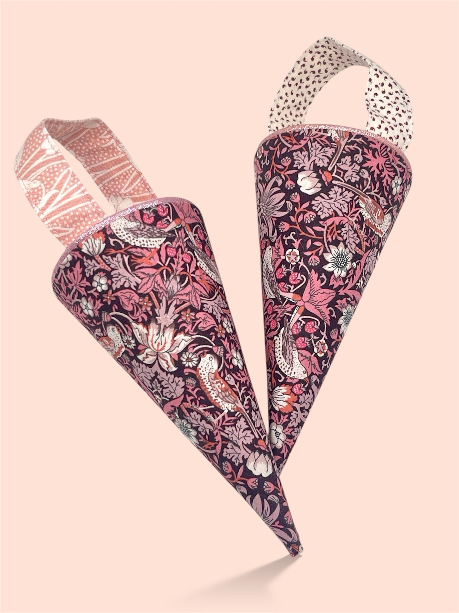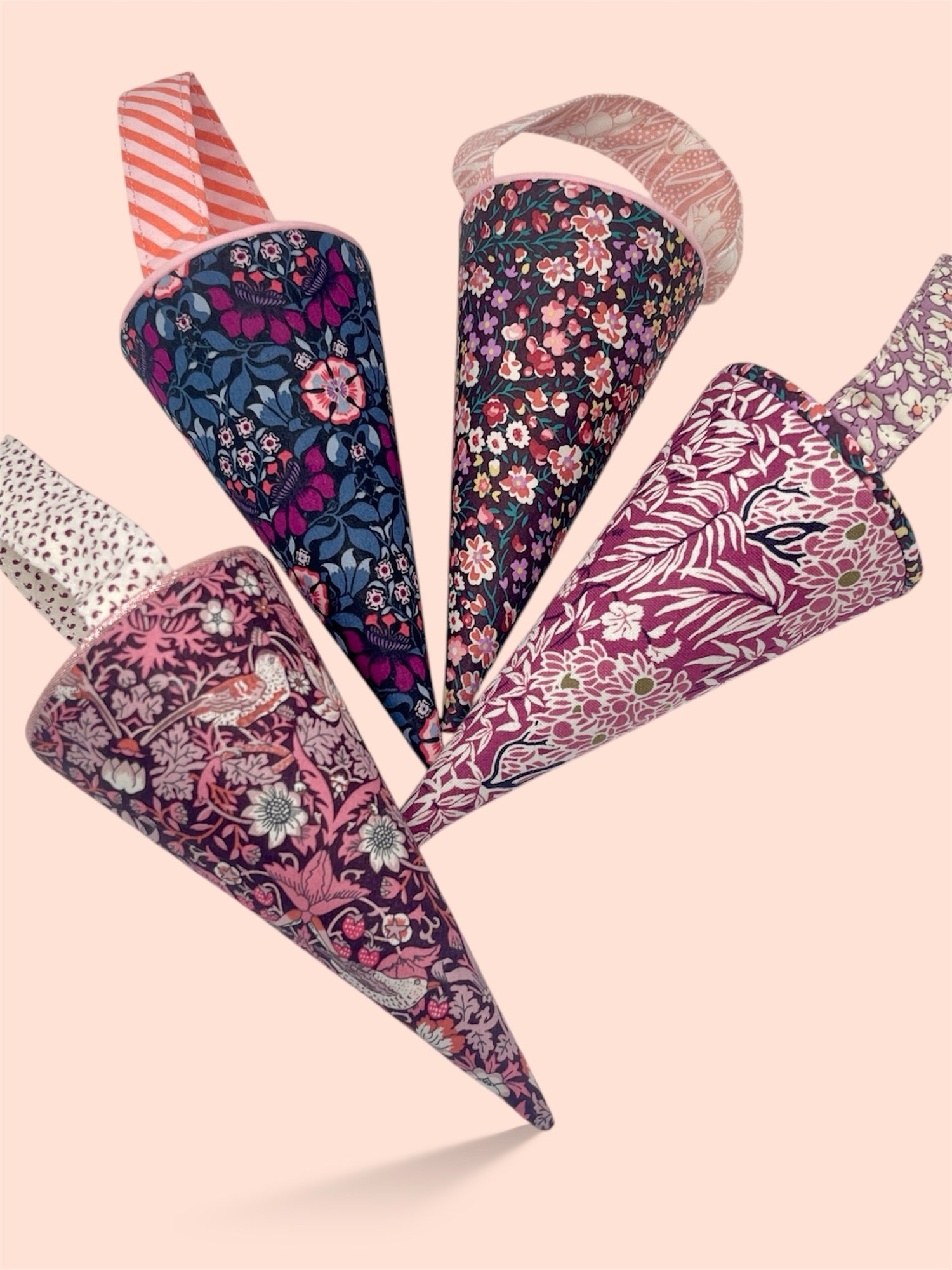 Kræmmerhuset består af en papkegle beklædt med Libertystof, kantet med pipingbånd og foret med uldfilt. Hanken er syet i velour. Selve keglen er 14 cm høj.